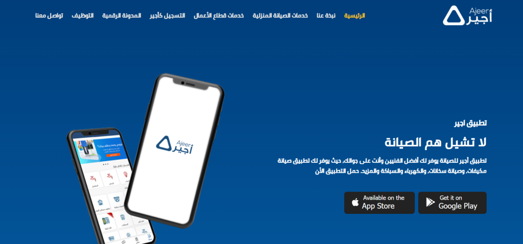 نستطيع أن نقول بأن أجير من أفضل التطبيقات السعودية في الصيانة المنزلية من خلال الجوال وهو عبارة عن منصة تربط أفضل الفنيين بالمستخدمين لإصلاح الأعطال وأي مشكلات قد تطرأ في منازلهم بكل سهولة. بالإضافة إلى ذلك، مع Ajeer تستطيع أن تقول وداعا للصيانة المنزلية المزعجة التي لا يريدها الكثير من المستخدمين. ابحث عن الخدمة التي تناسبك من بين العديد من خدمات الصيانة المنزلية وسوف تجد عامل متخصص ذو كفاءة يقوم على الفور بإصلاح العطل أو المشكلة في منزلك بكل سهولة. مع أجير لا داعي للقلق من أي شئ، حيث يوفر مجموعة من أفضل الخدمات المقدمة من قبل عمالة مدربة على أعلى مستوى وكل هذا بأسعار معقولة.