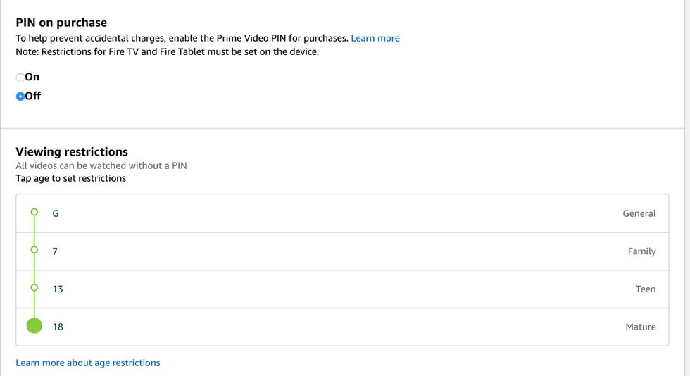 - تمتلك أمازون إعدادات مشابهة للتحكّم الأبوي تسمح لك بحظر المحتوى حسب فئة تقييمه، لكن أولًا عليك إعداد رمز مرور PIN.