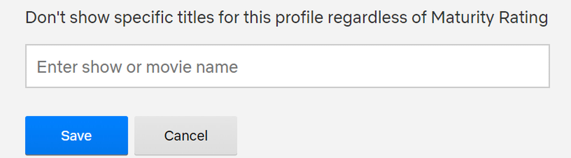 - كما تستطيع أيضًا حظر أفلام ومسلسلات بعينها في بروفايل طفلك بغض النظر عن تقييمه، وفي هذه الحالة يجب أن تذهب إلى صفحة حسابك على نتفلكس باستخدام الكمبيوتر، ثم الذهاب إلى Profile & Parental controls. واذهب إلى البروفايل الذي ترغب في تعديله، ثم مرر لأسفل حتى ترى هذا الصندوق.