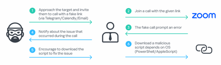تستهدف حملة GhostCall أجهزة macOS وتبدأ بهجوم هندسي اجتماعي متقن ومخصص لكل ضحية بشكل كبير. حيث يتواصل المهاجمون مع الضحايا عبر تطبيق Telegram منتحلين صفة مستثمري رأس ماليين، وأحياناً يستخدمون حسابات مخترقة لرواد أعمال ومؤسسي شركات ناشئة حقيقيين للترويج لفرص استثمار أو شراكة. ويُدعى الضحايا إلى اجتماعات استثمار وهمية على مواقع تصيد تحاكي منصات Zoom أو Microsoft Teams، حيث يُطلب منهم «تحديث» برنامجهم لحل مشكلة في الصوت. وعند تنفيذ ذلك، يتم تحميل كود برمجي خبيث وتثبيت برمجية تجسس على الجهاز.