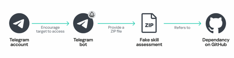 أما في حملة GhostHire، تستهدف المجموعة مطوري البلوك تشين عبر انتحال صفة مسؤولي توظيف. يتم خداع الضحايا لتنزيل وتشغيل مستودع GitHubيحتوي على برمجية خبيثة يتم تقديمها على أنها اختبار مهارات. تشترك حملة GhostHire في البنية التحتية والأدوات نفسها مع حملة GhostCall، لكنها بدلاً من استخدام مكالمات الفيديو تركز على استهداف المطورين والمهندسين العمليين عبر جهود توظيف مزيفة. وبعد التواصل الأولي، تتم إضافة الضحايا إلى روبوت تيليجرام يرسل إليهم ملف ZIP أو رابط GitHub مع مهلة قصيرة لإتمام المهمة. وعند تشغيل الملف، يقوم البرنامج الخبيث بتثبيت نفسه على جهاز الضحية وفقاً لنظام التشغيل المستخدم.