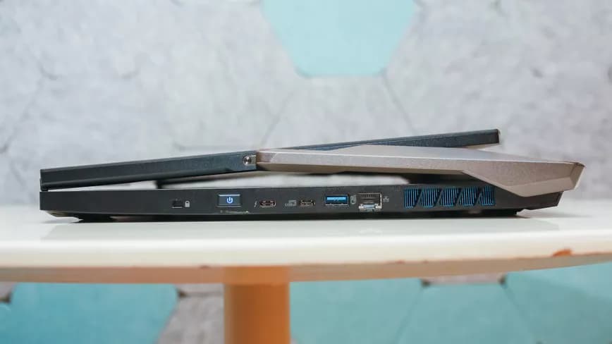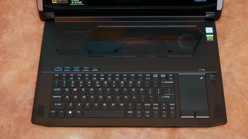 هناك الكثير من فتحات التهوية في جميع أنحاء Acer Predator Triton 900، بعضها لإدخال الهواء والبعض الآخر لإخراجه، وهي ضرورية لتبريد هذا الحاسوب الذي يمكن أن تصل درجة حرارته إلى 70 درجة مئوية أثناء تشغيل لعبة مثل Battlefield V على دقة 4K مع مميزات تتبع الأشعة وDLSS من إنفيديا.