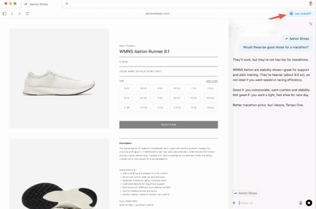 - متصفح ChatGPT Atlas: عبارة عن متصفح يركز على الذكاء الاصطناعي. حيث تم تصميمه ليتمحور بالكامل حول شات جي بي تي. يظهر روبوت الدردشة في شريط جانبي ثابت وجاهز للإجابة على أسئلتك ومساعدتك في كتابة مقالة أو ترجمة شيء ما أو حتى تلخيص المحتوى دون الحاجة إلى التنقل بين النوافذ أو فقدان سياق ما تقرأه.