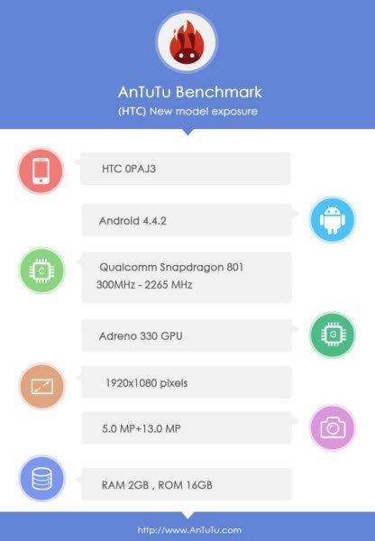 على اي حال، فإن الجهاز المزعوم يحمل رقم موديل HTC OPAJ3، ويتميز بكثافة 1080 بيكسل. اما بالداخل، فنجد رقاقة Snapdragon 801 رباعية النواة بتردد 2.26 جيجا هرتز، مع معالج رسوميات Adreno 330 GPU، وذاكرة عشوائية 2 جيجا بايت.