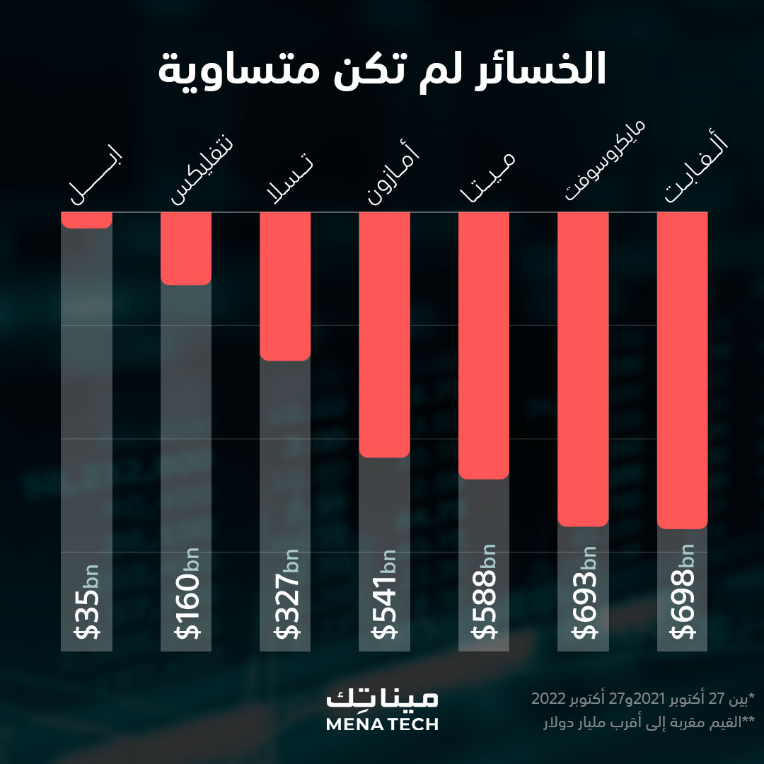 أكبر 7 شركات تقنية أمريكية هي على الترتيب: ابل، مايكروسوفت، ألفابت، أمازون، تسلا، ميتا، نتفليكس. لكن الخسائر لم تتوزع على هذه الشركات بشكل متوازٍ، بل كانت بعض الخسارات أكبر بكثير من سواها. وكانت خسائر كل من ألفابت ومايكروسوفت أكبر بعشرين ضعفاً من خسائر ابل على سبيل المثال.