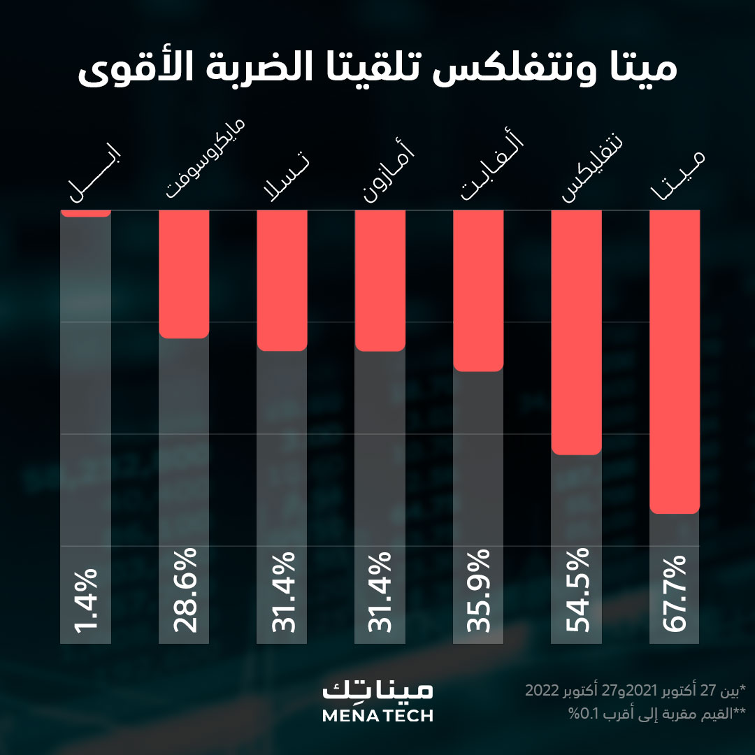 من الناحية الأخرى، هناك كل من ميتا ونتفليكس اللتين كانتا الأكبر خسارة كنسبة مئوية من قيمة الشركة السابقة. حيث فقدت نتفليكس حوالي 54.5% من رأس مالها السوقي خلال عام واحد. وفي نفس الفترة خسرت ميتا 67.7% من قيمتها قبل عام وفقدت مركزها ضمن أكبر 20 شركة أمريكية.