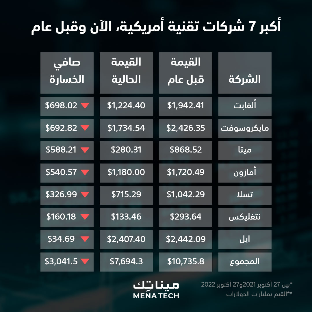 ⬤ فقدت 7 شركات تقنية 3 تريليون دولار من القيمة السوقية خلال عام واحد بين أكتوبر 2021 و2022.