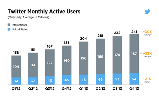 تويتر, 241 مليون مستخدم نشط شهرياً و 184 مليون مستخدم عبر الهاتف