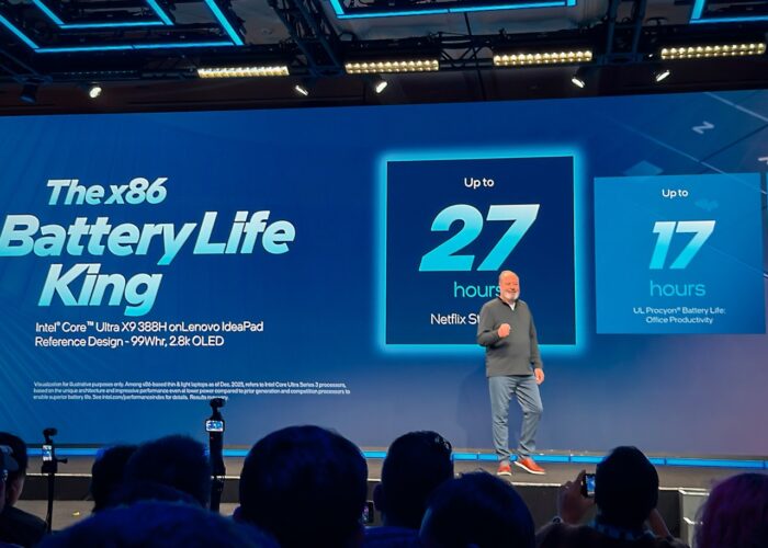 Within the mobile lineup, Intel introduced new Intel Core Ultra X9 and X7 processors with integrated Intel Arc graphics. Top configurations list up to 16 CPU cores, 12 Xe-cores, and 50 NPU TOPS. Intel’s published benchmarks also list up to 60% better multithread performance and up to 77% faster gaming performance versus its Lunar Lake reference platform comparisons, along with up to about 27 hours of battery life in a Netflix streaming test configuration.