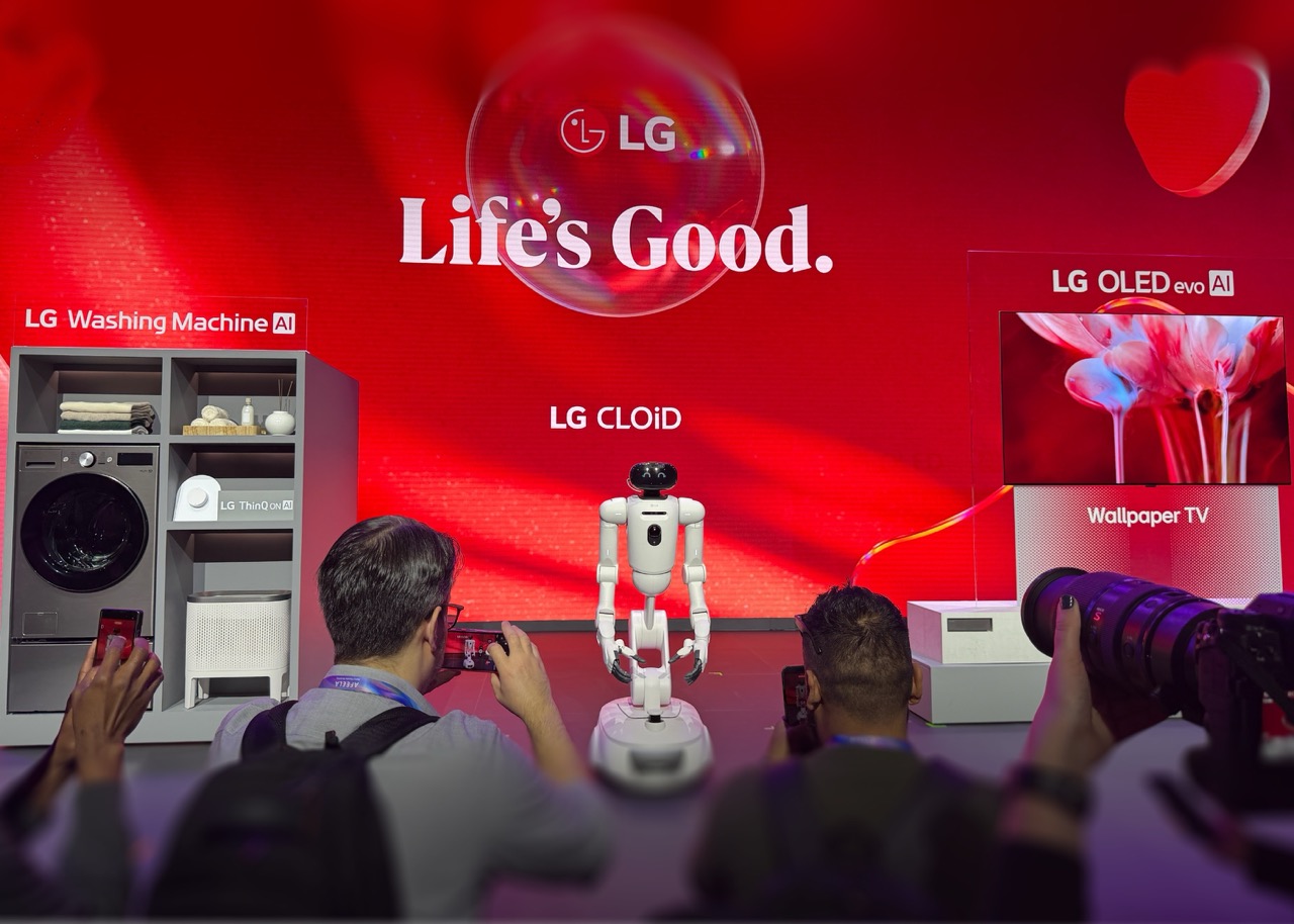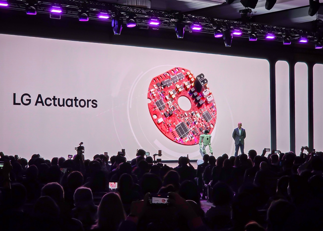 LG framed the head as a mobile AI home hub, combining a chipset, display, speaker, cameras, sensors, and voice-based generative AI for communication, environment learning, and appliance control. The company also highlighted “Physical AI” using vision-language models that turn visual and verbal input into actions for tasks like opening doors or moving objects.
