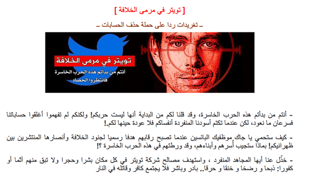 قام أنصار تنظيم داعش بنشر منشور يهدد فيه مؤسس وموظفي شبكة التواصل الاجتماعي تويتر بالقتل رداً على حذف حسابات التنظيم الإرهابي من على الشبكة.