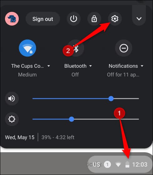 بعد تسجيل الدخول إلى حسابك على كروم انقر على الساعة في الركن السفلي الأيمن لفتح لوحة النظام system tray ولوحة الإشعارات notification panel، ومن هناك انقر فوق أيقونة الإعدادات.