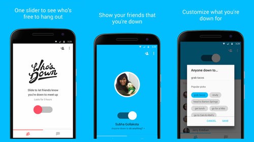 أصبح إخبار أصدقائك بأنك جاهز لتقضية بعض الوقت والتسلية ممكناً، فقد قامت جوجل ودون أي إعلان رسمي بإطلاق تطبيق جديد يدعى Who's Down على متجر Google Play و App Store وهو متوافر للتحميل لمستخدمي iOS واندرويد لكن استخدامه يحتاج إلى رمز عن طريق الدعوة.