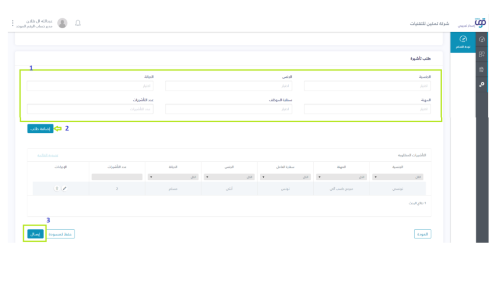 - ثم يتم النقر على أيقونة الاستقدام بعد ذلك يتم اختيار طلب منح رصيد التأشيرات.