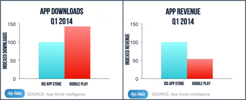 هذه البيانات التي شملت 150 بلداً حول العالم توضح تفوق متجر جوجل بلاي خلال الأشهر الثلاثة في 2014 ولكنه تراجع بشكل مخيف أمام متجر أبل خلال الربع الثاني من 2014.