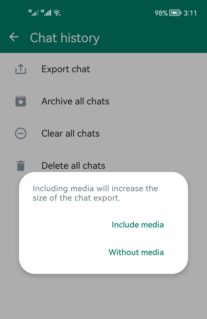 - انتقل إلى تاريخ الدردشات واختر تصدير الدردشة